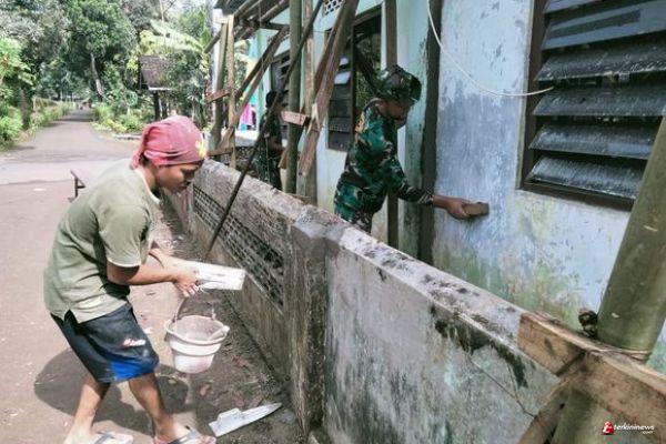Anggota Satgas TMMD, Serda Ari yang berada di lokasi tampak tengah melakukan pembersihan pada dinding yang akan di cat.
