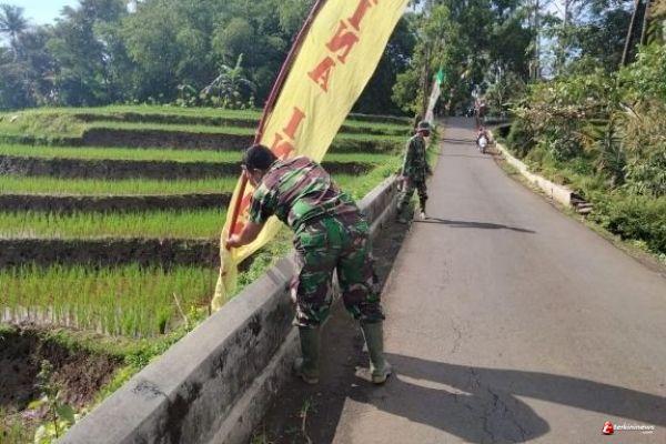 Kabupaten Semarang - Anggota Satuan Tugas (Satgas) Tentara Manunggal Membangun Desa (TMMD) Reguler ke-110 Kodim 0714/Salatiga memasang umbul-umbul di kanan kiri jalan menuju lokasi TMMD di Desa Ketapang Umbul-umbul tersebut dipasang guna menyemarakkan mendekati waktu penutupan Program TMMD di Desa Ketapang.