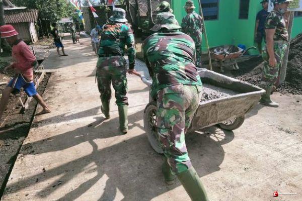 Kabupaten Semarang- Kegiatan TNI Manunggal Membangun Desa (TMMD) ke-110 Kodim 0714/ Salatiga tahun 2021, anggota satgas bersama warga Desa Ketapang terus berupaya maksimal untuk menyelesaikan pembangunan jalan rabat beton di Dusun Sarimulyo Desa Ketapang Kecamatan Susukan Kabupaten Semarang.