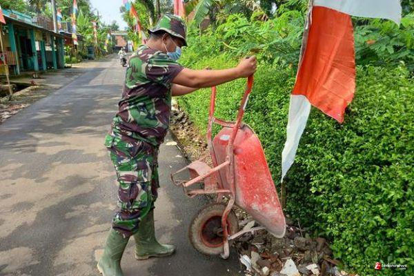 Untuk penimbunan bahu jalan, Kopda Aris Jatmiko, memanfaatkan pecahan bata sisa rehab mushola.