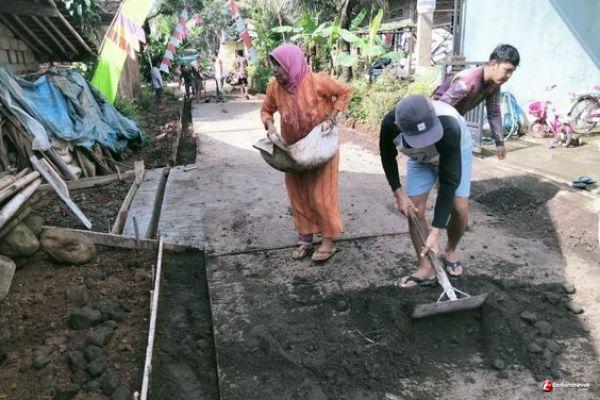 Kaum ibu-ibu turut andil menyumbangkan tenaganya membantu penggarap pembangunan pengecoran jalan.