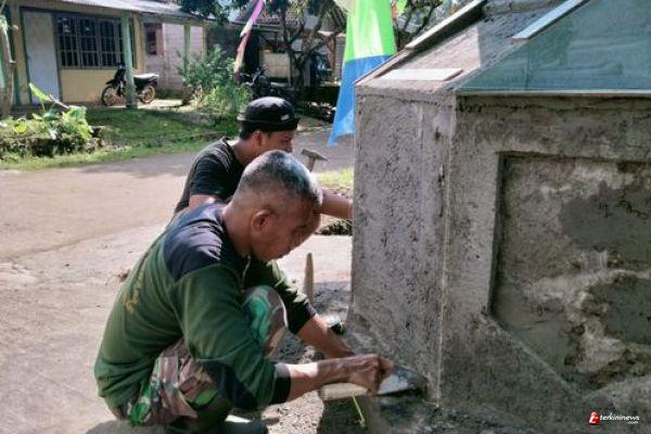 Serda Hadi terus memacu diri untuk menyelesaikan Tugu prasasti di ujung jalan lokasi pengecoran jalan rabat beton.