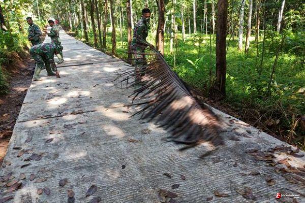 Tidak ada Akar Rotanpun jadi. Kopda Sutrisno dan Praka Dedi sedang membersihkan sisa-sisa material di atas jalan yang baru selesai di cor, hanya dengan menggunakan daun kelapa kering menyapu sisa material dan kotoran daun kering agar terlihat bersih. Dengan semangat tak kenal lelah selalu berupaya memaksimalkan setiap pekerjaan. (*Pendim 0714/Salatiga).