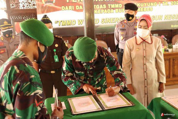 Penandatanganan Berita Acara Serah Terima Hasil TMMD dan Prasasti peresmian hasil TMMD sengkuyung Tahap I Tahun 2021, dilakukan Komandan Kodim 0713 Brebes bersama Bupati Brebes.