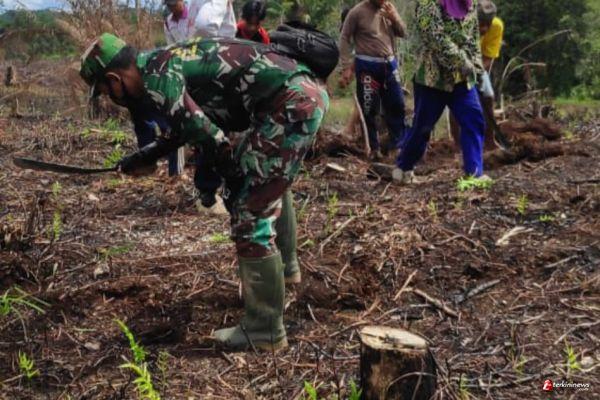 Pengkadan - Panas Terik masih bersama warga saat anggota satgas yang tergabung dalam TNI Manunggal Membangun Desa (TMMD) ke-110 .Dalam pelaksanaannya mereka dibantu warga dengan cara Kerja Bakti ,bersamaasyarakat Buak Limbang dalam pembersihan lahan pembangunan Pondok Pesantren.