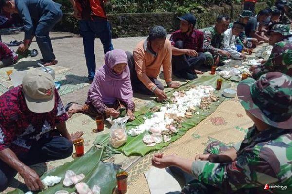 Seperti halnya yang dilakukan personel anggota TMMD di perempatan jalan dekat tugu prasasti. mbah Yati(72) Salah satu warga desa ketapang ikut dalam acara syukuran ,tak perduli cuaca terik.warga desa menyediakan makanan ala kadarnya dijadikan menu makan bareng untuk acara syukuran.
