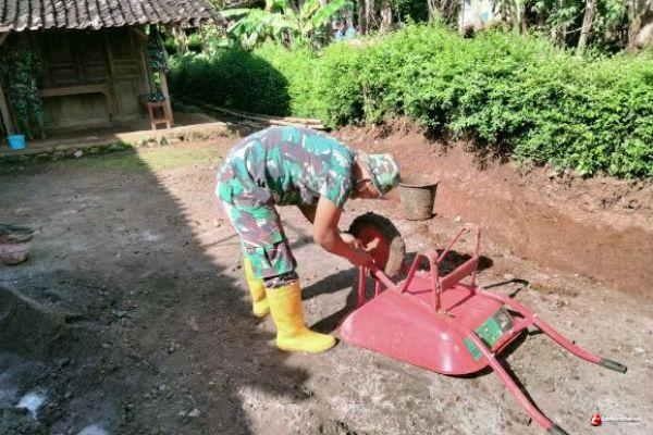 Kabupaten Semarang- Anggota TMMD dan warga lebih dahulu memperbaiki angkong yang rusak sebelum bekerja, untuk memperlancar pekerjaan. Peranan angkong sangat penting yang akan untuk mengangkut material.