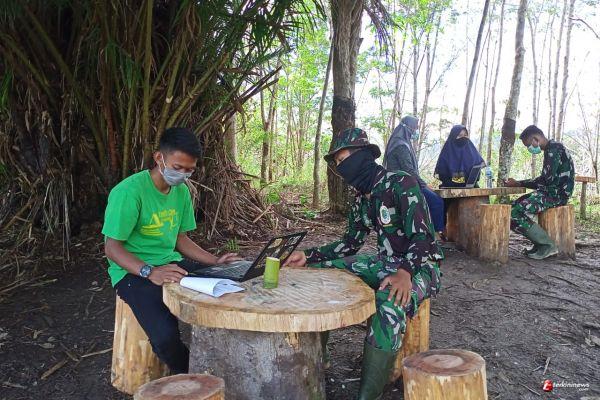 Pengkadan -Nampak terlihat Muda Mudi di lokasi Wisata urban bersman satgas TMMD 110 Putussibau dalam pengerjaan tugas sekolah yang melaui internet ,Bukit Manggis Wisata Urban memang satu satu tempat yang memiliki sinyal forji baik telkomsel maupu indosat,hal itu yang mendorong Satgas TMMD yang bersama karang taruna menjadi tempat Wisata Urban dan dalam digiral corner yang sampai saat ini masih berlanjut dalam pwngerjaannya,Selasan 30/3/2021.