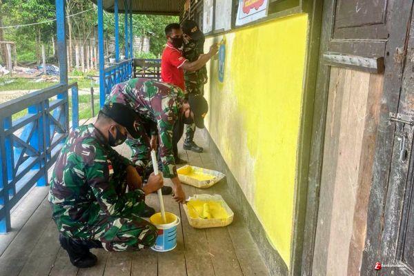 Agar Terlihat Nyaman & Menarik, Satgas Pamtas Yonif 407/PK Bantu Pengecetan Sekolah