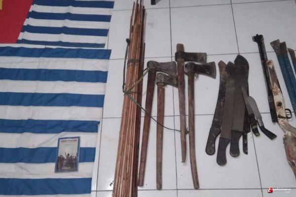 Adapun barang bukti yang berhasil diamankan oleh pasukan TNI Polri, berada dalam sebuah Honai yang dimiliki Lesmin Waker, antara lain : 1 Unit Helm Militer, Dokumen, Berbagai Senjata Tajam, Panah, HP.
