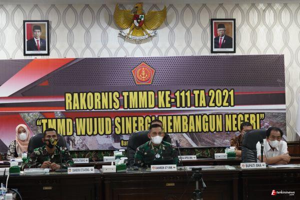 “Vicon ini untuk menyamakan persepsi tentang berbagai program pemerintah yang dapat disinergikan melalui TMMD Reguler -111 yang akan dilaksanakan mulai 15 Juni hingga 14 Juli 2021 mendatang,” terang Danrem.