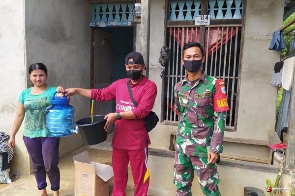 Seberuang - Guna menekan dan memutus mata rantai penyebaran COVID-19 di wilayahnya, Babinsa Koramil 1206 - 16/Seberuang bersama satgas Desa tangguh membagikan sarana cuci tangan berupa tong air/galon, ember, sabun cuci tangan dan hand sanitizer bagi warganya, di Desa Emperiang, kecamatan Seberuang, Kabupaten Kapuas Hulu, Jumat (28/05/2021).