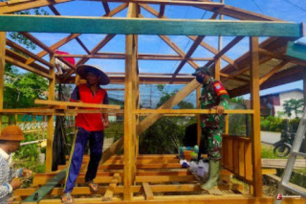 Pengkadan - Terlihat Babinsa 1206-09/Jongkong Pengkadan Sertu Sumadi, Praka M.Zulfiqor bantu pengerjaan pembuatan Poskampling di Desa Mawan Kecamatan Pengkadan. Sabtu, (29/05/202)
