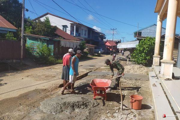 Putussibau - Babinsa Koramil 1206 -02/Semitau, Serka Rochmat, membantu warga memperbaiki jalan rusak di Desa Semitau Hulu.