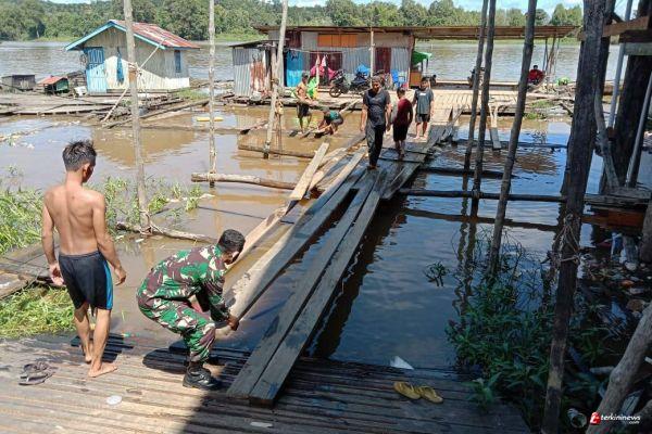 Semitau - Babinsa Koramil 1206-02/Semitau Kopda Agus bersama warga bergotong royong bahu-membahu untuk membuat titian jalan yang akan di gunakan warga untuk aktifitas sehari hari masyarakat di semitau hulu, Kecamatan Semitau Hulu, Kabupaten Kapuas Hulu. Minggu (30/05/21)