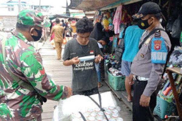 Jongkong -Terlihat Babinsa Koramil 1206-09/Jongkong, Kades Jongkong Pasar, Babinkamtibmas Terapkan Protokol Kesehatan dan bagikan masker di Pasar Bidadari Kecamatan Jongkong. Senin, (31/05/2021)