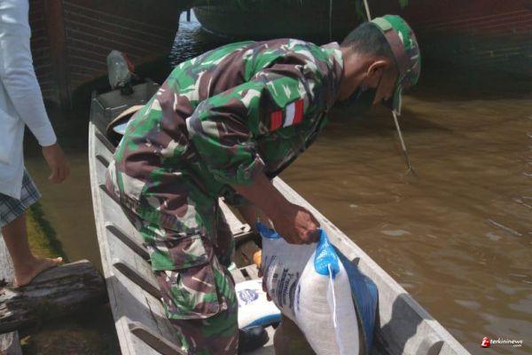Babinsa Praka Junaidin membantu masyarakat membawa angkutan barang belanjaan di Penyeberangan yang menghubungkan desa Embaloh Kiri dan Embaloh Kanan yang berada diseberang sungai Kapuas, Kamis (01/06/2021).