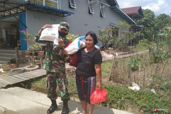Praka Junaidin anggota Koramil 01/Embaloh Hilir membantu warga binaan Fransiska (33) mengangkat barang belanjaan, di Kecamatan Embaloh Hilir, Kabupaten Kapuas Hulu, Kamis (03/06/2021).
