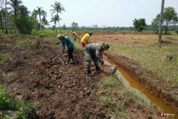 Serda Juliansyah Babinsa Desa Nipah Kuning, Koramil 1203-11/Sph, membantu warga binaan membangun jalan di Desa Nipah Kuning Kecamatan Simpang Hilir, Kayong Utara. Selasa (8/6/2021)