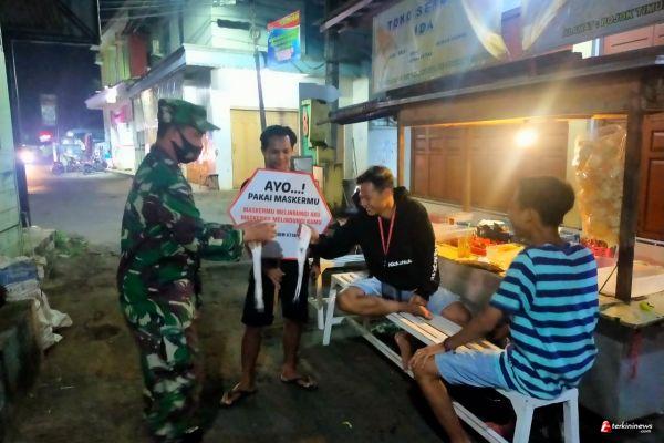 Seperti halnya dilakukan Batuud Peltu Arifin bersama rekan Babinsa menghimbau masyarakat tetap mematuhi protokol kesehatan dan membagikan masker disekitaran komplek Pasar Tersono, Kecamatan Tersono, Kabupaten Batang, Minggu (13/6/12) malam.