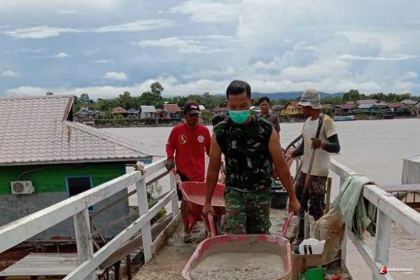 Jongkong - Terlihat Kekompakan Warga Bersama Babinsa 1206-09/Jongkong dalam pengecoran jalan menuju Dermaga di Dusun Citra Melati Desa Jongkong Pasar kecamatan Jongkong Kabupaten Kapuas Hulu. Selasa, (15/06/2021)