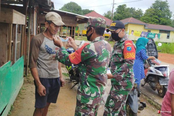Putussibau - Babinsa Sebagai aparat teritorial diwilayah binaannya, dimusim pandemi ini tidak henti-hentinya berupaya mencegah dan mengamankan warganya dari virus untuk memutus rantai penyebaran Covid-19, sebagaimana dilakukan oleh Babinsa Koramil 1206-02/Semitau, Kopda Agus Rudiyanto di Desa Semitau Hulu, Kecamatan Semitau membagikan masker secara gratis. Selasa (15/06/2021)