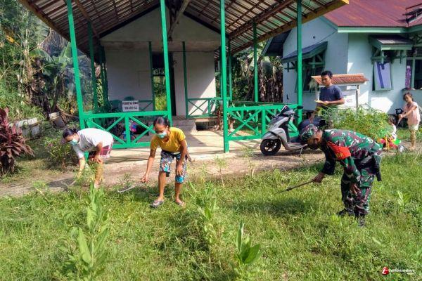 Kalis - Babinsa Koramil 1206-12/Kalis, Kodim 1206/Putussibau, Koptu Samsudin, turut serta membantu membersihkan lingkungan sekitar Posyandu Tajo Si Kombong, yang berada di Desa Rantau Kalis, Kecamatan Kalis, Kabupaten Kapuas Hulu, Provinsi Kalimantan Barat. Jum'at, (18/06/2021).