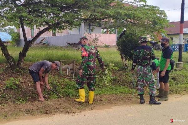 Silat Hilir - Danramil 11/Silat Hilir Lettu Arm Yusman , bersama masyarakat bergotong royong membersihkan parit, di Desa Miau Merah, Kecamatan Silat Hilir, Jum'at (18/06/2021).