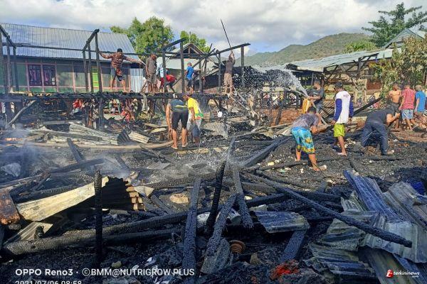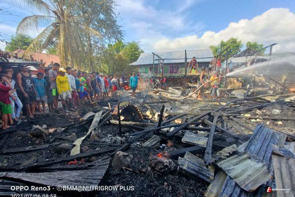 Masing - masing 1 unit rumah 12 tiang milik Wahyudin dan Kaharudin, sementara 1 unit rumah batu disamping hanya rusak ringan di sambar si jago merah dari pantauan media ini secara langsung di TKP kebakaran.
