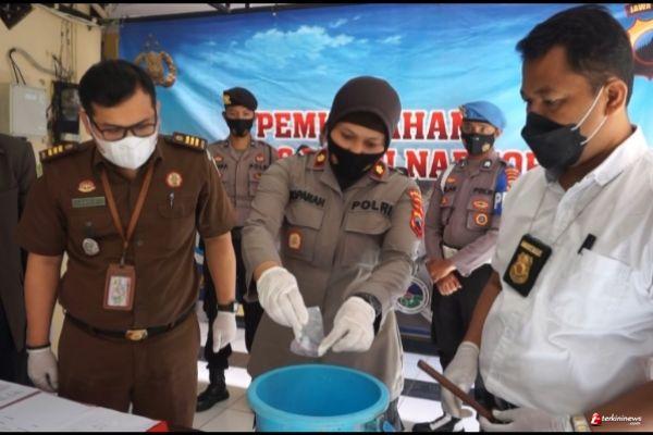Barang bukti narkotika jenis sabu dimusnahkan dengan cara dimasukkan dalam ember berisi air. Kemudian dilarutkan selanjutnya dibuang di saluran tempat pembuangan hingga tidak bisa digunakan lagi.