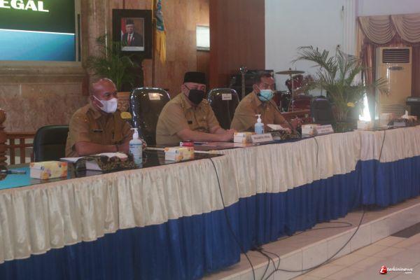 TEGAL - Pelaksanaan Rapat Evaluasi Penanganan Covid-19 oleh Pemerintah Kota Tegal berlangsung di Ruang Adipura Kota Tegal. Rapat secara langsung dipimpin oleh Wali Kota Tegal H. Dedy Yon Supriyono, sekaligus Ketua Gugus Tugas Covid 19 Kota Tegal, Senin (26/7).