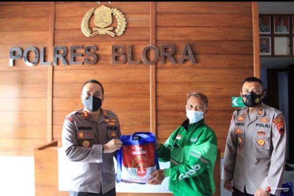 Polres Blora Polda Jawa Tengah membagikan bantuan sosial berupa paket sembako kepada komunitas ojek online yang ada di kabupaten Blora, Jumat, (06/08/2021).