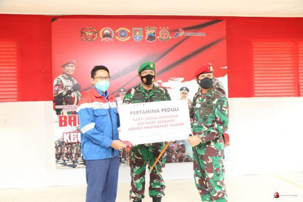 Cilacap - Wujud peduli terhadap kesulitan masyarakat yang terdampak pandemi Covid-19 Kopassus, Kodim 0703 Cilacap dan Pertamina RU IV Cilacap melaksanakan Bakti Sosial (Baksos) berupa pemberian sembako dan Obat gratis kepada masyarakat Cilacap yang terdampak Covid-19.