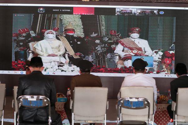 TEGAL - Forum Komunikasi Pimpinan Daerah (Forkopimda) Kota Tegal mengikuti Upacara Peringatan HUT ke-76 Kemerdekaan Republik Indonesia di Istana Negara secara virtual dari Pendopo Ki Gede Sebayu, Komplek Balai Kota Tegal, Selasa (17/8/2021).