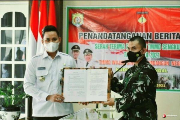 Bupati Kendal, Dico M Ganinduto B.Sc menandatangani berita acara serah terima program TNI Manunggal Membangun Desa (TMMD) Sengkuyung Tahap III Tahun Anggaran 2021, Rabu (15/09/2021) di ruang Paringgitan Kabupaten Kendal.