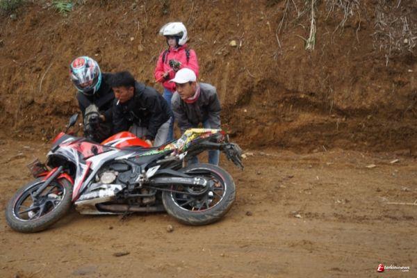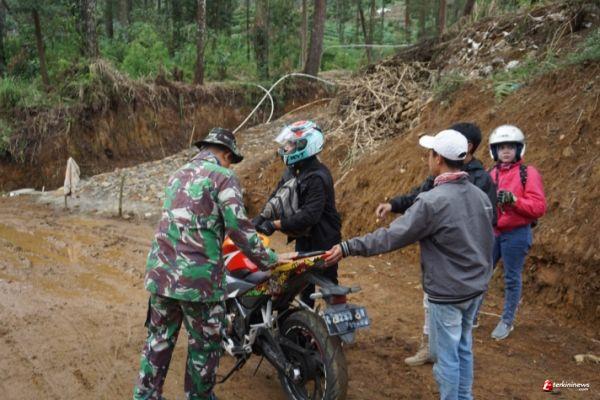 Saat melintasi jalan tersebut, mereka sempat turun dari sepeda motor miliknya karena jalan berlumpur dan licin, Serma Ruslan salah satu anggota Satgas TMMD langsung menghampiri dan menolongnya.