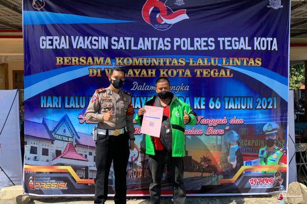 TEGAL - Dalam rangka memperingati HUT Lalu Lintas ke-66 Satuan fungsi lalu lintas Polres Tegal Kota menggelar kegiatan vaksinasi bersama Komunitas Lalu Lintas bertempat di Klinik Adhi Pradana jalan KS Tubun Kota Tegal, Sabtu (18/9/2021).