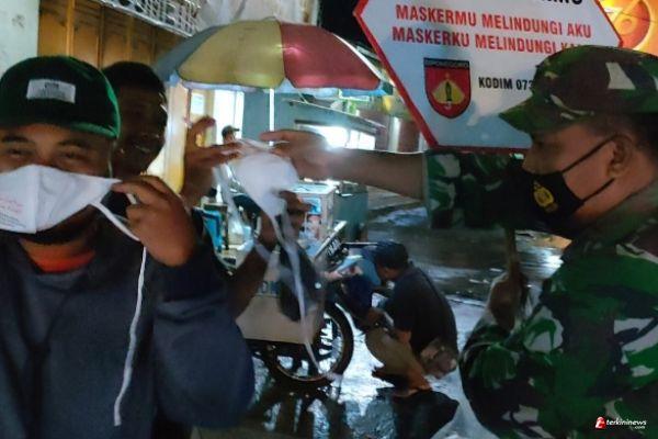 Untuk mengantisipasi terjadinya kerumunan masyarakat yang sedang menikmati waktunya dimalam libur, Satgas Covid-19 Koramil 06/Tersono, Babinsa Serka Kusen bersama anggota melakukan edukasi, himbauan dan membagikan masker kepada masyarakat di Jalan Raya Tersono - Sukorejo, pada Sabtu (25/9/21) malam.