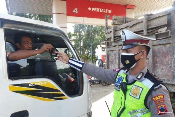 Satlantas Polres Kendal melaksanakan edukasi protokol kesehatan (prokes) dengan membagikan masker kepada masyarakat yang beraktifitas di Seputaran SPBU Jambearum Kecamatan Patebon Kabupaten Kendal, Rabu (6/10/2021).