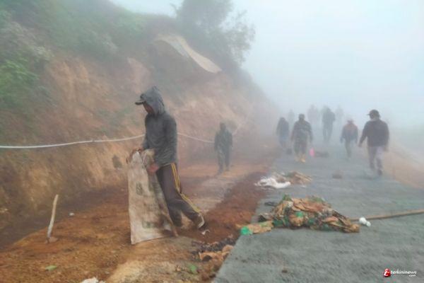 Kendati cuaca sangat panas di pagi, siang cuaca berubah menjadi kabut namun tak menyurutkan semangat warga untuk tetap bekerja bahu membahu menuntaskan pekerjaan.