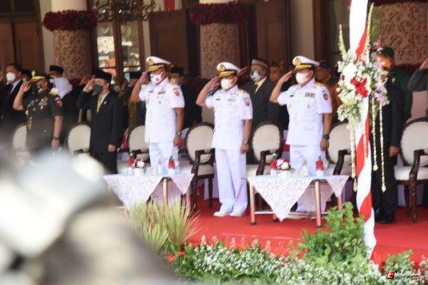Sekretaris Lembaga Akademi Angkatan Laut (Seklem AAL), Laksamana Pertama TNI Samsul Rizal, S.E., M.M, mewakili Gubernur AAL, Mayjend TNI (Mar) Nur Alamsyah, S.E., M.M., M.Tr (Han) menghadiri Upacara Perngatan Puncak Hari Jadi ke-76 Jawa Timur yang digelar di Halaman Gedung Negara Grahadi, Surabaya, Rabu (13/10).