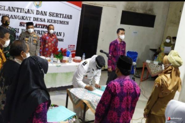 Pelaksanaan kegiatan pelantikan dan pengambilan sumpah janji jabatan perangkat desa tetap memperhatikan protokol kesehatan dengan memakai masker, berlangsung dengan aman dan tertib.