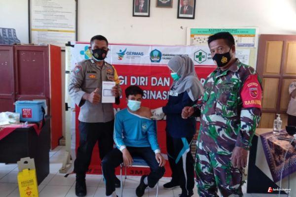 Sinergitas TNI - POLRI ditunjukkan Serma Jainal Jalil Babinsa Ramil 1509-05/Kayoa dan Bripka Zaenal Babinkamtibmas Kayoa saat Mengawal pelaksanaan Vaksinasi Covid 19 ke Siswa-Siswi SMPN 37 Halsel di Kecamatan Kayoa Kabupaten Halmahera Selatan Propinsi Halmahera Selatan. Selasa (09/11/2021)
