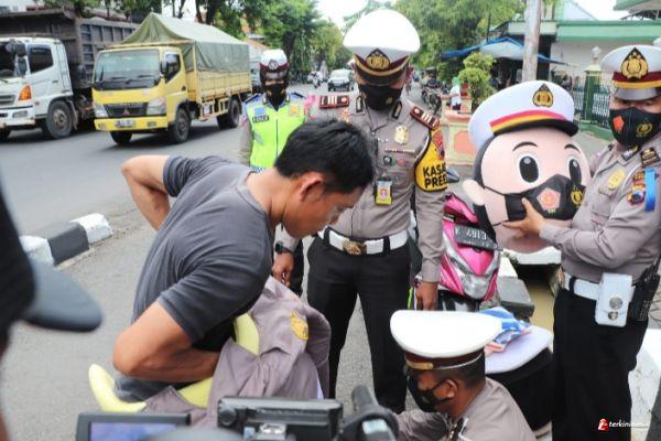 Tidak ada denda atau tilang bagi pelanggar lalu lintas dan prokes ini. Petugas meminta pelanggar mengenakan pakaian badut polisi dan ikut memberikan imbauan kepada pengguna jalan.