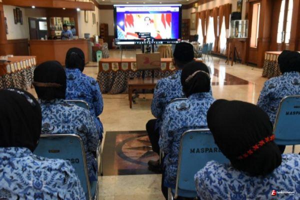Rayakan Hari Ualang Tahun ditengah pancemi Covid-19, personel Pegawai Negeri Sipil Akademi Angkatan Laut (PNS AAL) secara virtual mengikuti rangkaian upacara peringatan Hari Korps Pegawai Republik Indonesia (Korpri) ke-50 yang mengusung tema “ASN bersatu, Korpri Tangguh Indonesia Tumbuh” di Gedung Dewakang, Kesatrian AAL Bumimoro, Surabaya, Senin (29/11).