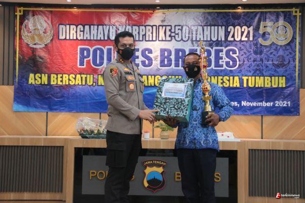 Kapolres Brebes juga memberikan penghargaan kepada ASN Polres Brebes yang berprestasi, Pengda TK I Hendro Aji Prabowo yang berhasil menjadi juara pertama dalam lomba Pengucapan Panca Prasetya KORPRI Tingkat Kabupaten Brebes Tahun 2021.