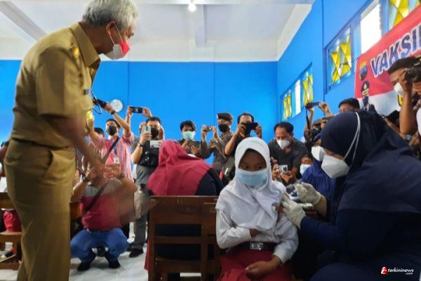 Gubernur Jateng Ganjar Pranowo, SH, M.IP., bersama rombongan didampingi Forkopimda kota Pekalongan meninjau pelaksanaan vaksinasi Covid-19 untuk anak usia 6-11 th, bertempat di SDN 3 Podosugih dan SDN 3 Tirto Kecamatan Pekalongan Barat Kota Pekalongan..