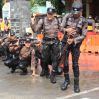 Sambil berjalan jongkok, semprotan dari mobil watercanon tidak menyurutkan langkah bintara remaja ini berjalan ke tengah lapangan untuk mendapatkan baret.