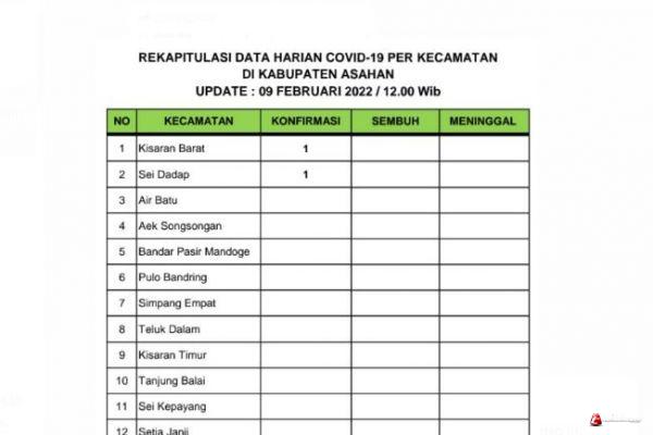 ASAHAN - Rekapitulasi Harian Covid – 19 per Kecamatan untuk hari ini sebagaimana data surveilans dari seluruh Puskesmas di wilayah Kabupaten Asahan yang di kelola Dinas Kesehatan ada 2 orang yang Terkonfirmasi Positif, tidak ada yang Sembuh dan Tidak ada yang meninggal dunia akibat Covid – 19 Rabu (09/02/2022).