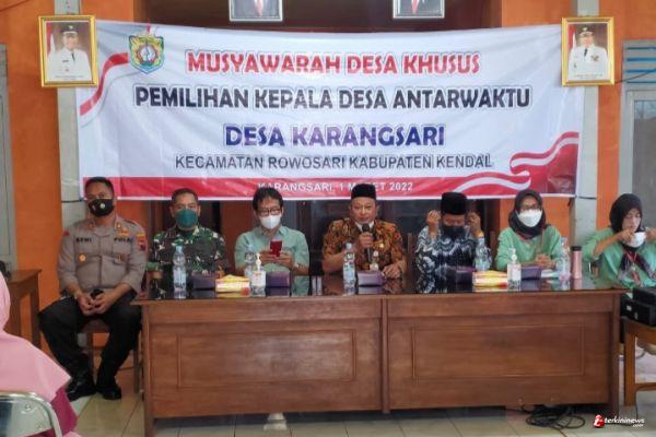 Anggota Polsek Rowosari melaksanakan pengamanan musyawarah Desa Karangsari Kecamatan Rowosari dengan agenda pemilihan kepala desa pergantian antar waktu (PAW) di balai desa Karangsari Kecamatan Rowosari Kendal, Selasa (1/3/2022).
